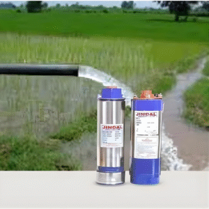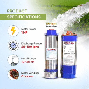 Jindal 1HP 4 Inch Pure Copper Water Filled Submersible Pump. High-performance, energy-efficient, and durable pump ideal for borewell, irrigation, and domestic water supply applications.
